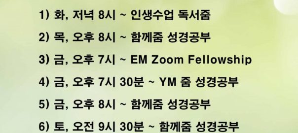 코로나바이러스 사태로 어렵고 힘든 가운데 줌을 통한 여러 모임을 통해서 서로의 안부를 확인하고, 서로를 위해서 기도하며, 하나님의 말씀으로 새힘을 얻는 여러 모임이 계속되고 있습니다. EM & YM … KM의 토요함께줌, 에바다 목장 줌모임, 목요함께줌, 인생수업 독서줌Read More…
